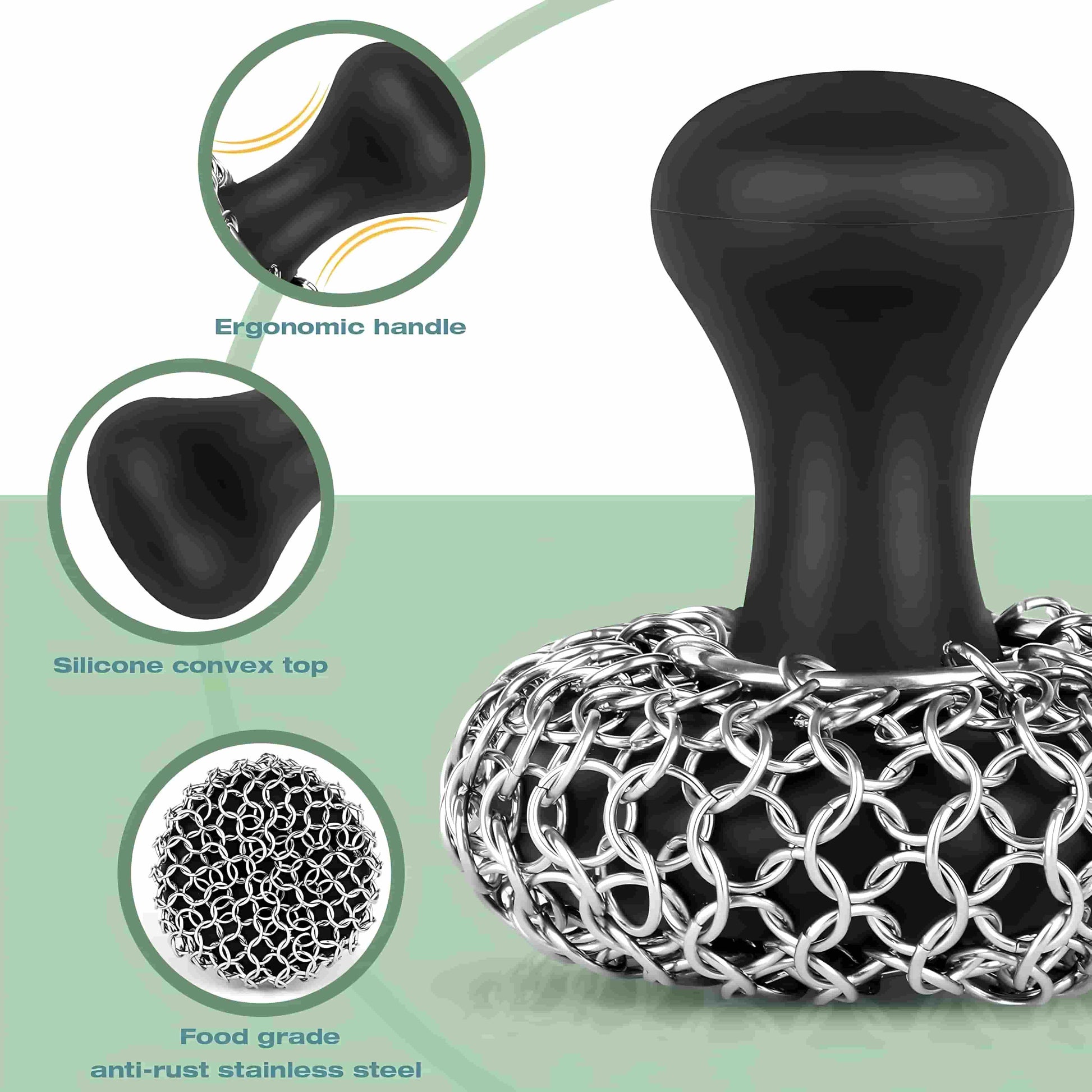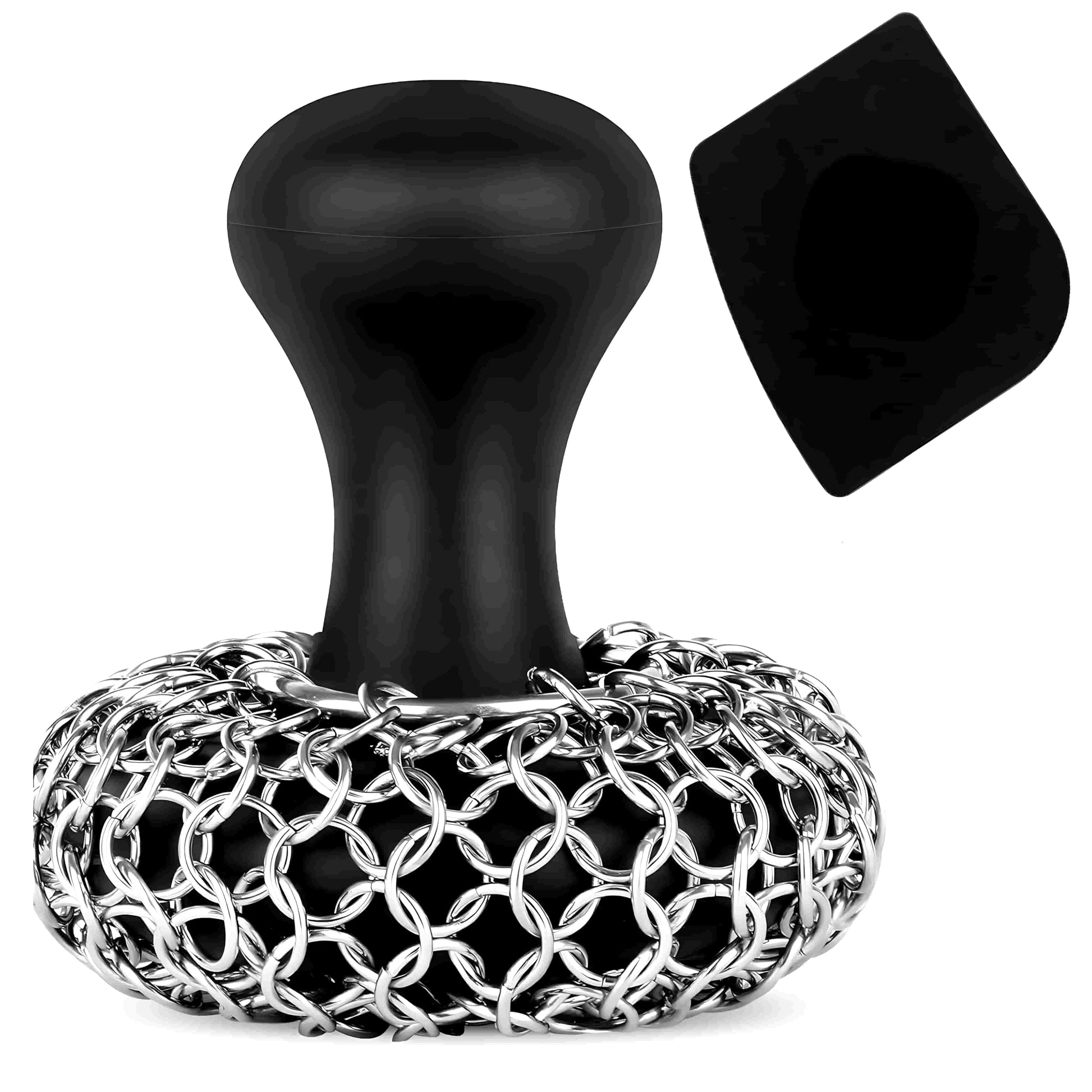 The Practical Cast Iron Cleaner Holder Including Specially Fitted Chain Mail (+Free Silicone Scraper)