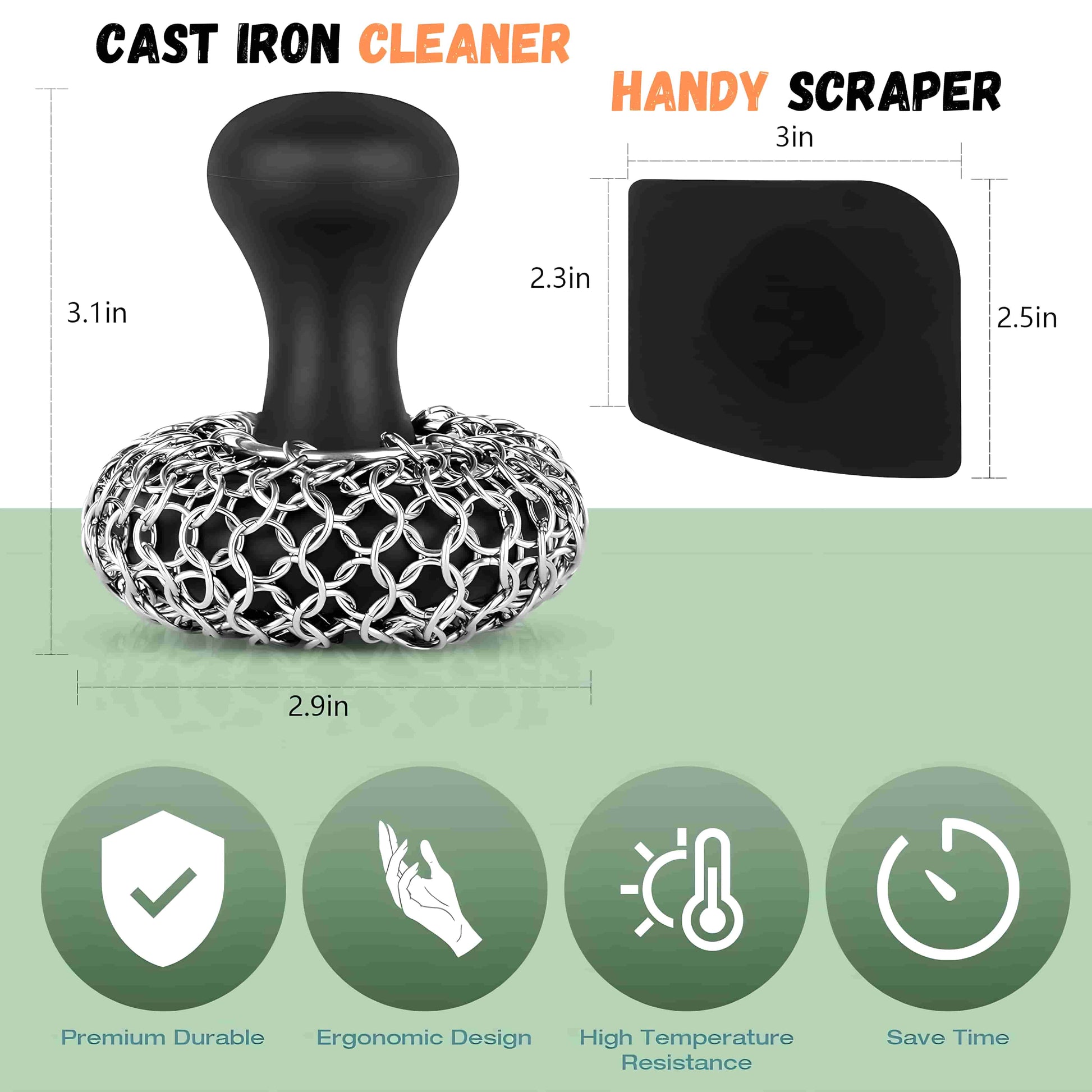 - Love Cast Iron Hate The Clean Up?: Don't we all. The specially designed chain mail makes light work of grubby messes whilst protecting your seasoning. And the handy included scraper gets stuck mess out of corners. The perfect combo for the home chef.