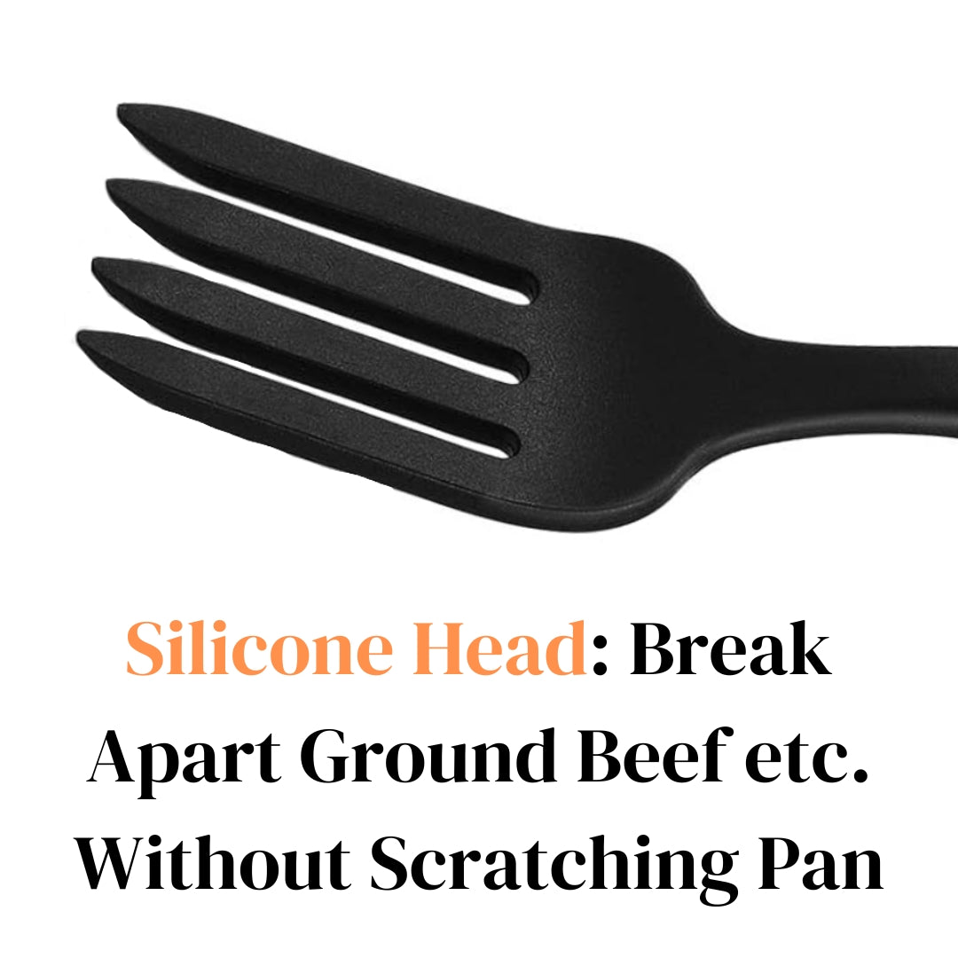 - Pure Silicone Material Protects Pans Whilst Breaking Apart Ground Beef And Stuck Food: Often in the kitchen we find ourselves poking at something with out stainless steel fork but this damages our precious pans, hence why we introduce this large silicone fork. The perfect solution of breaking apart ground beef and other food whilst protecting pans, pots & bowls.